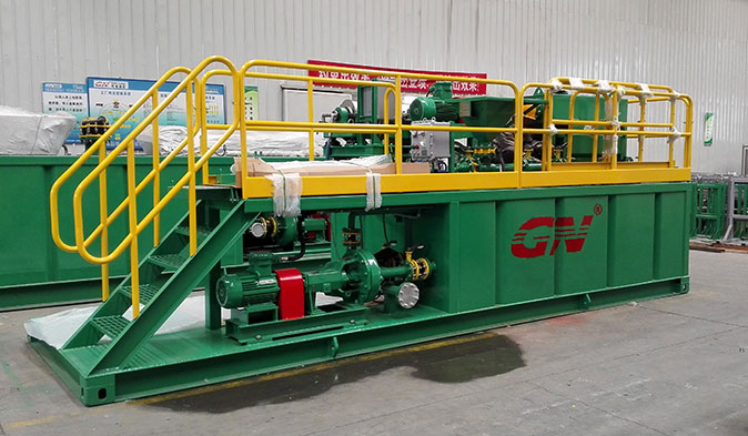 本套系統分為2個階段的固控處理和一套泥漿配置混合系統。鉆井泥漿初步分離采用的是冠能GNZS752型振動篩,200GPM的處理能力、兩片篩網的構造用來處理鉆井泥漿中的大顆粒的固體。振動篩處理后的液體通過離心泵輸送給迷你型的沉降離心機GNLW223進一步處理,可達3800RPM的轉速,分離的固體顆粒可達到2個微米。